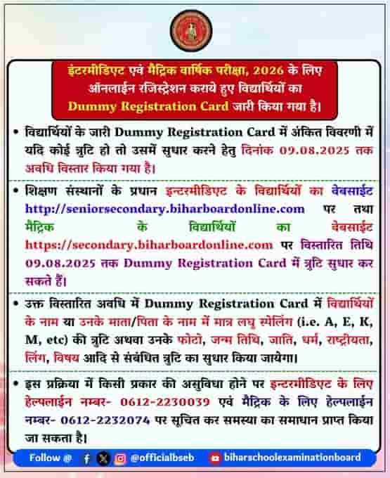Bihar Board Matric Dummy Registration Card 2026 Error Correction Process ?