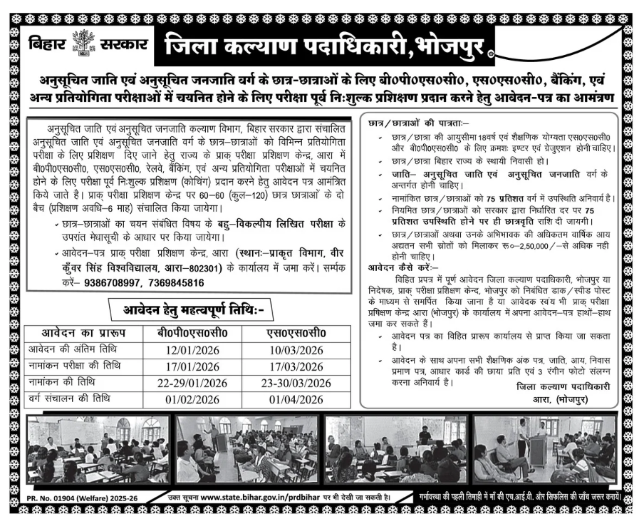 यदि आप SC/ST वर्ग से आते हैं और BPSC, SSC, Banking या Railway की तैयारी कर रहे हैं, तो भोजपुर जिला प्रशासन द्वारा चलाई जा रही यह फ्री कोचिंग योजना आपके लिए सुनहरा अवसर है। समय पर आवेदन करें और अपने सपनों की सरकारी नौकरी की दिशा में एक मजबूत कदम बढ़ाएं।