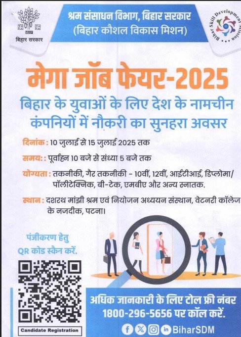 Patna Mega Job Fair 2025: तो क्या आप बिहार से है | तो आपको पता ही है की आज के समय में जब युवा पीढ़ी अपने भविष्य को लेकर संघर्ष कर रहे है, ऐसे में बिहार सरकार की यह पहल कि वह प्रदेश के युवाओं के लिए देश की नामचीन कंपनियों में रोजगार का मौका लेकर आई है, वाकई काबिल-ए-तारीफ है। “बिहार मेगा जॉब फेयर 2025“, जो कि 10 जुलाई से 15 जुलाई 2025 तक स्थान- दशरथ मांझी श्रम एवं नियोजन अध्ययन संस्थान, बेली रोड पटना में आयोजित किया जा रहा है |